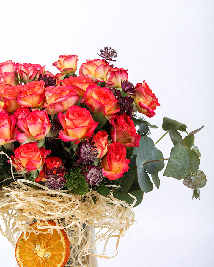 Bu çiçeği kendime hediye olarak aldım ve çok beğendim. Hem çiçeklerin renkleri hem de vazo ile birlikte görüntüsü çok güzel. Okaliptus ve astrantia bordo detayları da şık bir kombinasyon oluşturuyor. Özenli bir şekilde paketlenmişti ve tazeliğini korumuştu. Kesinlikle tavsiye ederim!